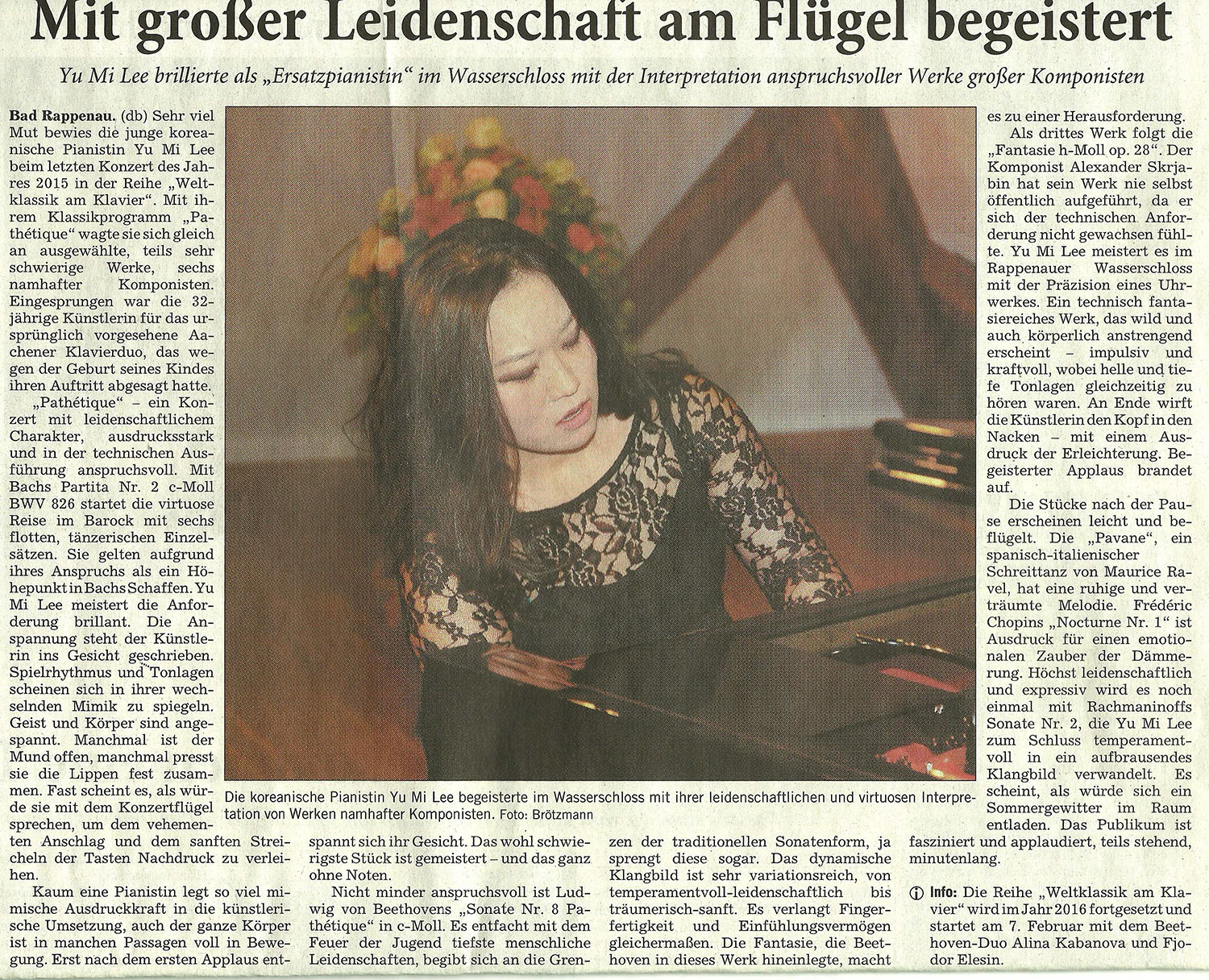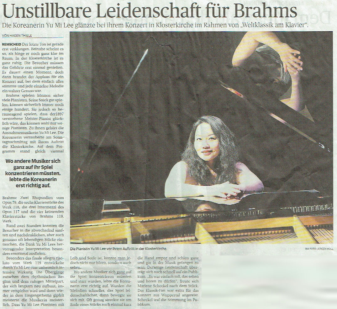 "Many pianists can play Brahms. A few hundred can even play his pieces well. But only a select few musicians could play his pieces so outstandingly that the master pianist himself, who died in 1897, would be satisfied. One of these few is the exceptional musician Yu Mi Lee."